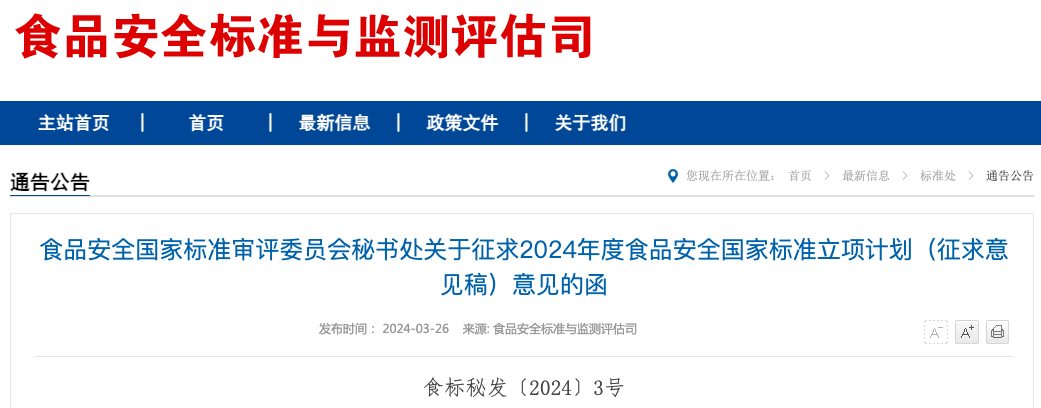 《2024年度食品安全國家標準立項計劃》公開征求意見!