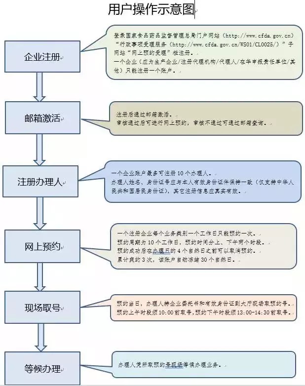 三、注冊(cè)方式。2017年7月20日起,申請(qǐng)人可登陸國(guó)家食品藥品監(jiān)督管理總局門戶網(wǎng)站“行政事項(xiàng)受理服務(wù)”子網(wǎng)站(http://www.cfda.gov.cn/WS01/CL0025/ )提前注冊(cè)(詳見用戶操作示意圖)。注冊(cè)審核通過后,企業(yè)方可辦理網(wǎng)上預(yù)約業(yè)務(wù)。