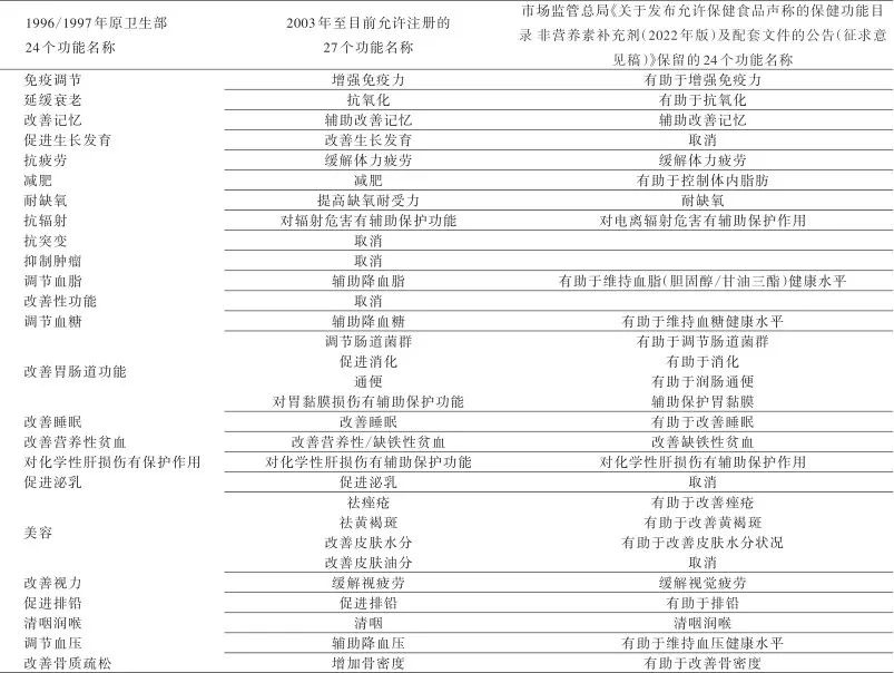 2018年3月,我國(guó)政府機(jī)構(gòu)職能再次調(diào)整,原國(guó)家食藥總局、國(guó)家工商行政管理總局和國(guó)家質(zhì)量監(jiān)督檢驗(yàn)檢疫總局并入新組建的國(guó)家市場(chǎng)監(jiān)督管理總局。2019年8月,國(guó)家市場(chǎng)監(jiān)督管理總局發(fā)布了《保健食品原料目錄與保健功能目錄管理辦法》[18],其中規(guī)定由國(guó)家市場(chǎng)監(jiān)督管理總局會(huì)同國(guó)家衛(wèi)生健康委員會(huì)、國(guó)家中醫(yī)藥管理局制定、調(diào)整并公布保健食品原料目錄和保健功能目錄;國(guó)家市場(chǎng)監(jiān)督管理總局食品審評(píng)機(jī)構(gòu)負(fù)責(zé)組織擬訂保健功能目錄,接收納入或者調(diào)整保健功能目錄的建議;任何單位或者個(gè)人在開展相關(guān)研究的基礎(chǔ)上,可以向?qū)徳u(píng)機(jī)構(gòu)提出擬納入或者調(diào)整保健功能目錄的建議。在保健功能調(diào)整和功能學(xué)評(píng)價(jià)方法的修訂方面,2019年3月市場(chǎng)監(jiān)管總局發(fā)布關(guān)于征求調(diào)整保健食品保健功能意見的公告[6],將現(xiàn)有27個(gè)保健功能和原來(lái)(原衛(wèi)生部早期)曾經(jīng)批過(guò)個(gè)別產(chǎn)品的18個(gè)功能分為三類:首批擬調(diào)整功能聲稱表述的保健功能(18個(gè)),擬取消的保健功能(3+18個(gè))和有待進(jìn)一步研究論證的保健功能(6個(gè))。經(jīng)兩次征求意見匯總處理后,市場(chǎng)監(jiān)管總局又再次于2022年1月12日發(fā)布關(guān)于公開征求《關(guān)于發(fā)布允許保健食品聲稱的保健功能目錄 非營(yíng)養(yǎng)素補(bǔ)充劑(2022年版)及配套文件的公告(征求意見稿)》意見的公告[19],保留了現(xiàn)有27個(gè)功能中的24個(gè)(并增加了相應(yīng)的“保健功能釋義”),取消了改善生長(zhǎng)發(fā)育、促進(jìn)泌乳和改善皮膚油分3個(gè)功能。我國(guó)保健食品功能名稱的變化見表1。