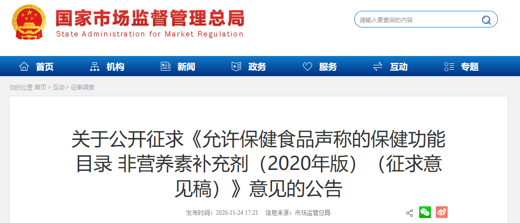 公眾還可以登錄國家市場監(jiān)督管理總局網(wǎng)站(http://www.samr.gov.cn),通過首頁互動欄目中的“征集調(diào)查”提出意見建議,或者將意見建議郵寄至:市場監(jiān)管總局特殊食品司,北京市西城區(qū)北露園1號,并在信封上注明“《允許保健食品聲稱的保健功能目錄 非營養(yǎng)素補充劑(2020年版)(征求意見稿)》公開征求意見”字樣。