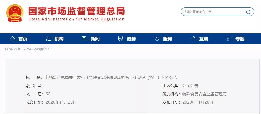 為規(guī)范特殊食品注冊現(xiàn)場核查工作,依據(jù)《中華人民共和國食品安全法》《保健食品注冊與備案管理辦法》《嬰幼兒配方乳粉產品配方注冊管理辦法》《特殊醫(yī)學用途配方食品注冊管理辦法》等法律規(guī)章,市場監(jiān)管總局制定了《特殊食品注冊現(xiàn)場核查工作規(guī)程(暫行)》,現(xiàn)予發(fā)布,自公布之日起施行。